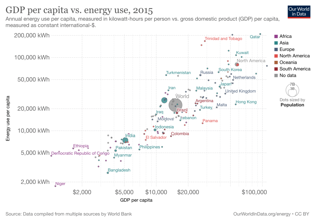 The roughly linear relationship on the log-log plot displayed below between per-capita GDP and energy use on a country by country basis clearly shows that economic output has a direct power-law dependence upon energy availability. Although GDP appears on the horizontal axis and energy consumption on the vertical, the dependence is actually economic output upon energy use. So cutting existing energy production in a modern economy, without replacing it, cuts-back its economic vitality.