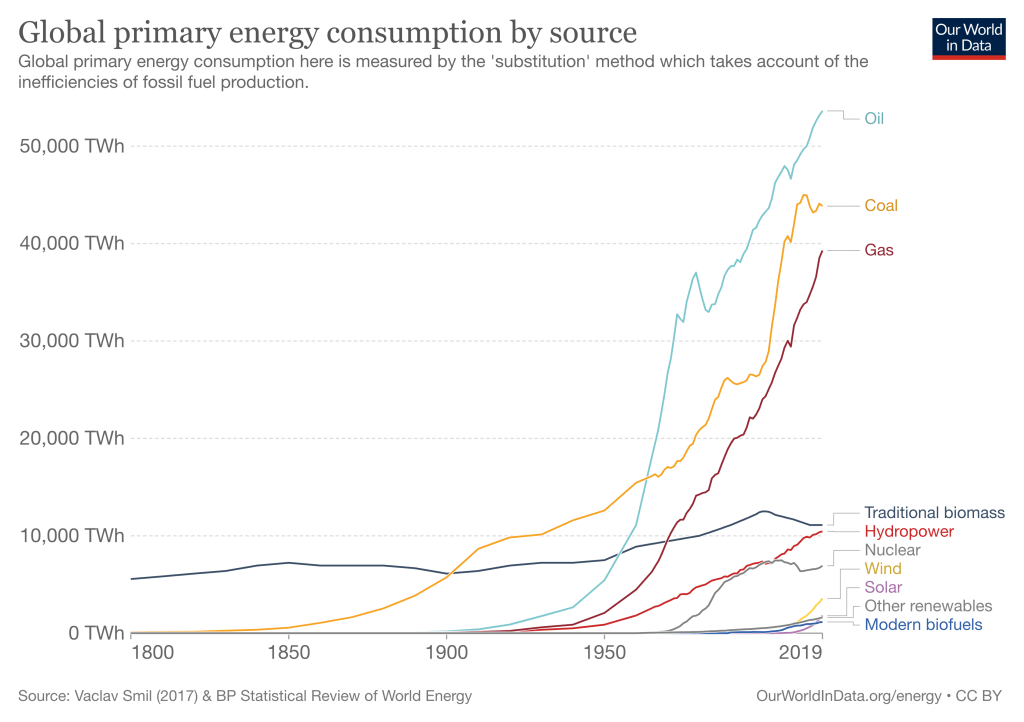 The plot below shows the contributions of the various available energy sources to the total usage through time. It clearly shows that up since 1950 the expansion of fossil fuel energy reliance has left the alternative sources far behind. Oil was responsible for around fifty-three thousand terawatt-hours of energy production in 2019, while the highest-contributing ‘clean-energy’ source, hydroelectric, accounted for only 1/5-th of that amount. Clearly, for any administration to turn away from oil, coal, and natural gas without having developed-and-proof-tested commensurate replacement energy sources on-hand is either monstrously egregious mismanagement or massive sabotage.
